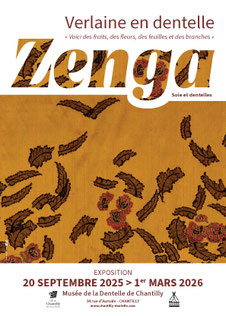 « Voici des fruits, des fleurs, des feuilles et des branches… » c’est autour de ces mots issus du recueil Romance sans parole - Aquarelles de Verlaine que l’artiste Zenga a construit son exposition pour le musée de la dentelle de Chantilly. Zenga s’appuie sur les décors que la dentelle propose pour créer des toiles en soie et dentelles. Dans la soie, Zenga aime la fluidité de la matière, ses couleurs lumineuses, sa brillance ; dans la dentelle, la régularité et la répétition des motifs qui offrent l’ampleur dont elle a besoin. Elle déconstruit cette mécanique, découpe, réassemble, reconstruit et insuffle de la vie entre les éléments nés de l’industrie. Le processus créatif de Zenga s’appuie directement sur la dentelle, sur les motifs qu’elle propose ; ces motifs inspirent le sujet de ses toiles. Les fleurs, les feuilles se transforment en écorces, en troncs, en branches pour créer un décalage poétique.